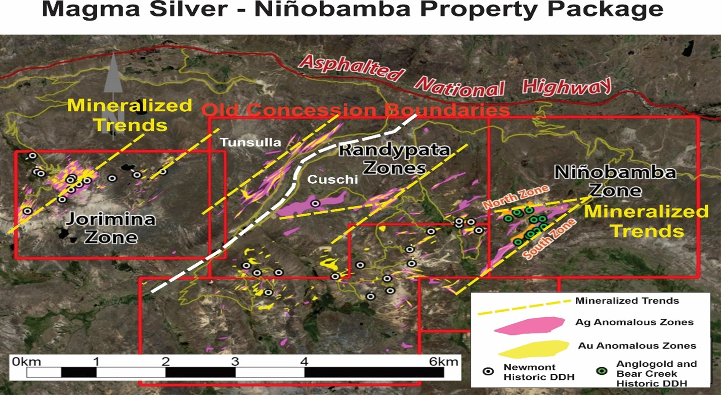 Magma Silver Corp. is a natural resources exploration company with a focus on acquiring, exploring, developing, and operating precious metal mining projects. Listed on the TSX Venture Exchange (“MGMA”), OTCQB (“MAGMF”), and Frankfurt Exchange (“BC21”), the Company’s primary focus is on exploring and developing the advanced Niñobamba silver-gold project in the mining-friendly country of Peru. Niñobamba spans an 8 km mineralized corridor in a prolific geological belt of a high-sulphidation epithermal system. Extensive exploration by Newmont Corporation, AngloGold Ashanti Limited, Bear Creek Mining Corporation and others, has demonstrated significant resource potential with over C$14.5 million invested to date. Magma Silver is advancing its Niñobamba project using modern geological modelling and a strategic development plan. The property has excellent infrastructure, strong relationships with local communities and a regional technical team with over 50 years of mining experience in Peru.